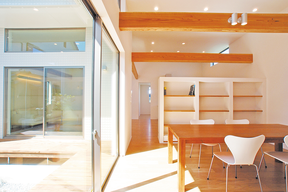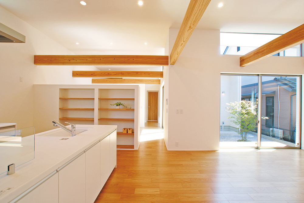 大きな窓から光と風を採り込み、外部の視線も気になりません。高い天井に整然と並ぶ大きな木の梁は、構造躯体を強固にすると同時に、動きのあるダイナミックな大空間を造り出しています。